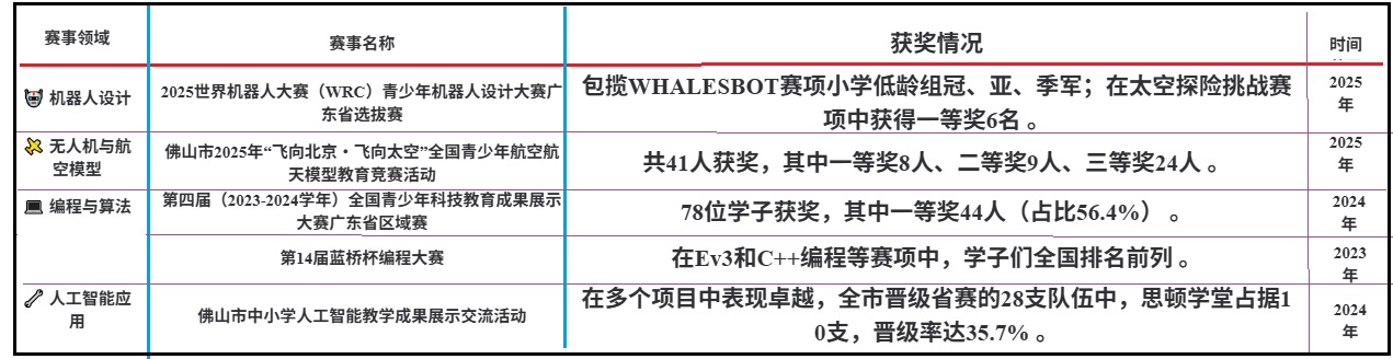 • 赛事认可度高:学员参与的多数赛事,如世界机器人大赛(WRC)、全国青少年科技教育成果展示大赛?ldquo;飞向北京・飞向太?rdquo;竞赛等,均属于教育部公布的全国性竞赛活动白名单,具有很高的权威性和认可??/h3>